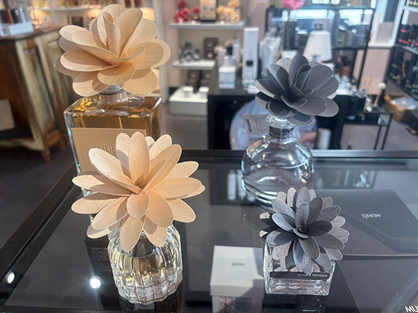 Het is een handgemaakte houten gekleurde bloem die de geur op een natuurlijke manier verspreidt. De bloem neemt de geuressence op en geeft deze subtiel af aan de ruimte, waardoor er een constante, zachte geur ontstaat die dagenlang blijft verrassen. Elke diffuser is een klein kunstwerk op zich: stijlvol, tijdloos en een prachtige toevoeging aan elk interieur.